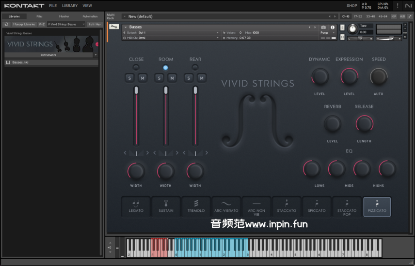Pulse Audio Vivid Strings Basses 的用户界面友好直观,使用者可以通过简单的滑块和按钮来调节各种参数,比如力度曲线、混响效果、音色平衡等。界面设计极简,但功能强大,适合从初学者到专业音乐制作人的各种需求。