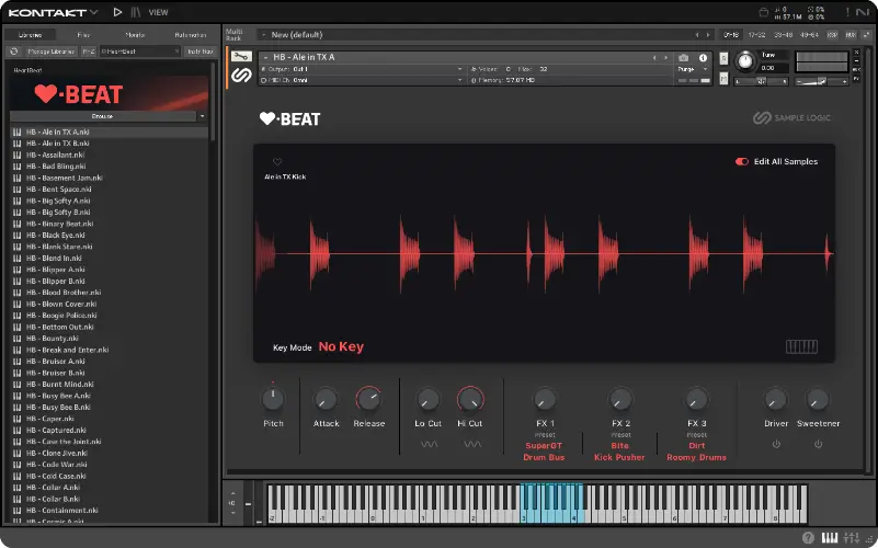 Pitch Shift / 键控 / 重调 | 可以整体或独立对循环做 ±1 八度的移调,也可将循环重新调入匹配工程调性 (Key Mode) (Sample Logic LLC) |