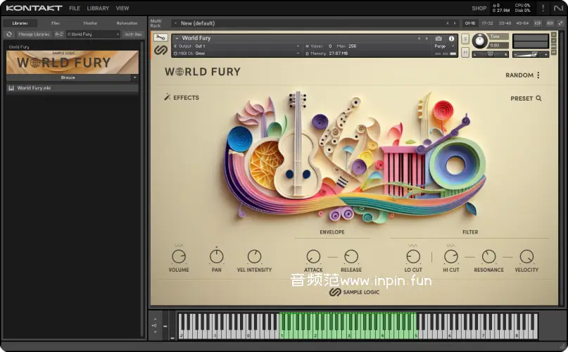 - 丰富的乐器和预设: World Fury 包含约 380 个多采样乐器和预设,涵盖了从拨弦、垫底、吹奏乐器到人声等多种音色,适用于多种音乐风格。