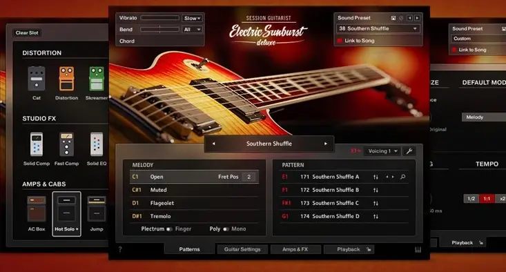 - 高质量采样库:Electric Sunburst Deluxe 包含超过 200 种模式和短语,这些都来自经典电吉他的录音,并且经过精细采样,能够捕捉真实吉他演奏的细微差别,包括滑弦、击勾弦、闷音等表现手法。