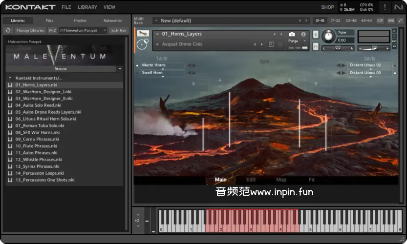 - 需要完整版的 Kontakt 6.6.1 或更高版本。请注意,Maleventum Pompeii 不支持免费版的 Kontakt Player。