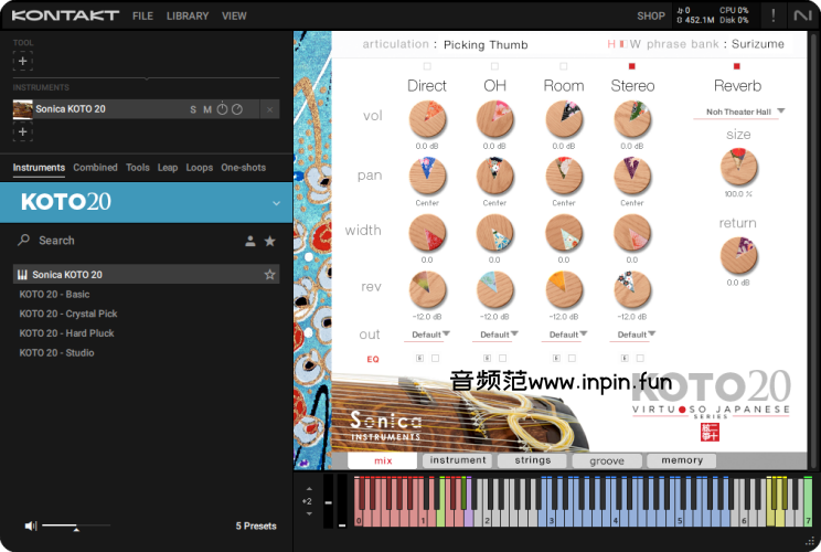 Sonica Instruments Koto 20 是一款结合传统日本古筝声音和现代虚拟乐器技术的音乐插件,适合各种类型的音乐制作。无论是在寻求传统音色的音乐创作中,还是在需要加入异国情调元素的现代作品中,它都能提供令人满意的音质和高度的表现力。如果你对传统乐器的音色有需求,或想为你的音乐增添一些亚洲风格的元素,Koto 20 无疑是一个值得尝试的工具。