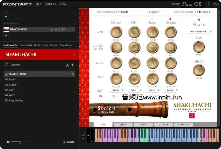 Sonica Instruments 的 Shakuhachi 是一款基于日本传统竹笛——尺八(Shakuhachi)制作的高品质虚拟乐器插件。尺八以其独特的音质、丰富的情感表现力和文化历史深受喜爱。Sonica Instruments 借助先进的采样技术,结合尺八大师的演奏录制,为音乐人提供了一种在虚拟环境中真实重现尺八音色的工具。