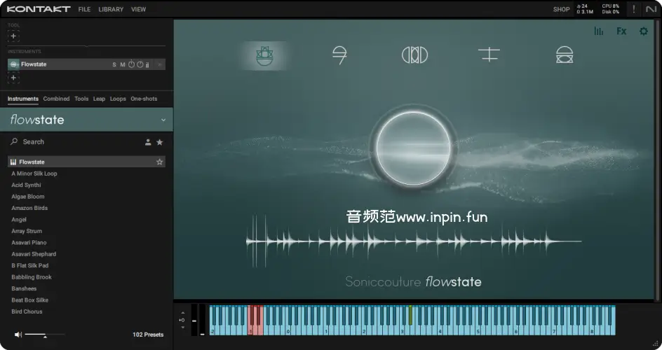 除了粒子合成,Flowstate 还集成了多种音色源,包括采样和合成声音。这些音色可以根据用户的需求进行深度编辑,允许对声音的每个细节进行精细调整。 -