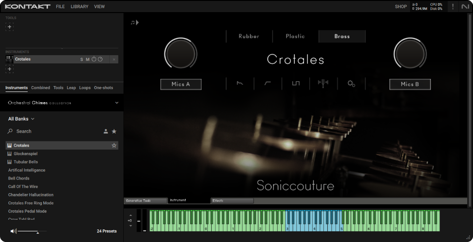 - 包含三种 Kontakt 虚拟乐器:Glockenspiel(定音鼓)、Tubular Bells(管钟)、Crotales(小钹)(soniccouture.com, bestservice.com)。