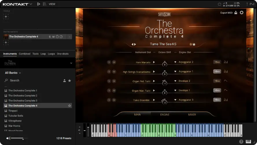 TOC4 基于 Native Instruments 的 Kontakt 引擎开发,包含 300 种乐器、1000 多个预设和 30GB 音源库,覆盖 80 人编制的完整管弦乐团及其扩展乐器。其预设系统引入 150 个全新“提示音”结构预设(如前奏、主音、尾音),通过按键开关变化系统实现动态段落切换,支持一键叠加八度音(Add-8va 功能),增强声场质感。界面划分为标题栏(MIDI 导出)、预设浏览器(多重筛选)、主面板(参数控制)和键盘范围可视化区,提升操作效率。用户可以轻松叠加多种乐器层,创建丰富编曲,同时每个层支持独立浏览器筛选声部。