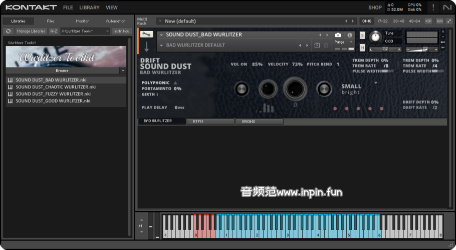 Bad Wurlitzer: 通过 AKAI MPC 100 的实时降调算法处理,提供从一个八度到一个半音的 12 个力度层次的采样。