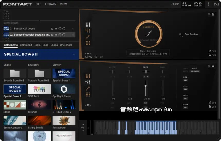 Special Bows 2 完全整合于Orchestral Tools的SINE Player中,提供了直观的用户界面,方便用户根据不同需求快速调整弓法、动态、演奏技法等细节。SINE Player还支持分层加载样本,减少系统资源占用,同时保持流畅的体验。