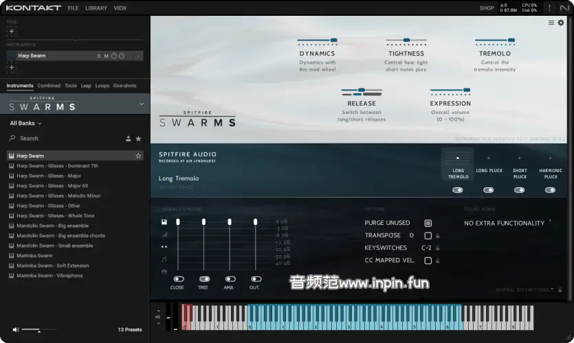 Spitfire Audio 最近发布了全新的虚拟乐器库——Spitfire Swarms。该库将之前仅在完整版 Kontakt 中单独提供的 Harp Swarm、Marimba Swarm 和 Mandolin Swarm 合并为一个综合性的 Kontakt Player 库,用户现在可以通过免费下载的 Kontakt Player 访问这些音色。