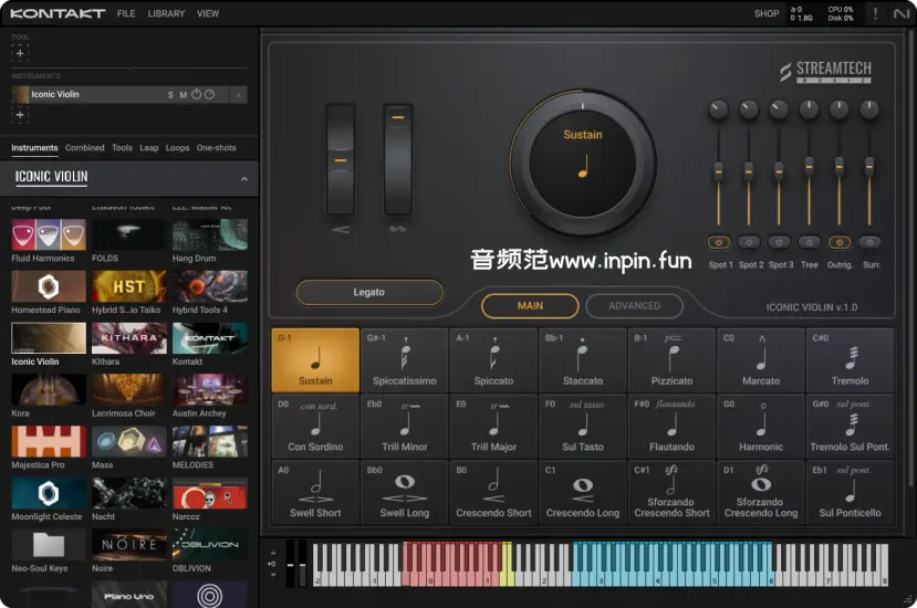 - 多种发音:Iconic Violin 提供了 21 种不同的发音,包括持续音、跳弓、断奏、拨弦(包括 Bartók 拨弦)、颤音、弱音、长音、短音等。