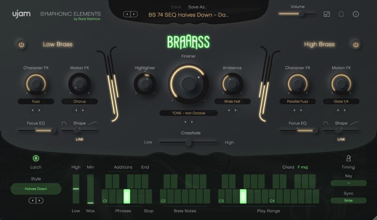 使用交叉渐变器进行黄铜部分。BRAAASS由两个独立的低部分和高部分组成。在它们之间无缝混合,或通过自动化添加细微的变化。
