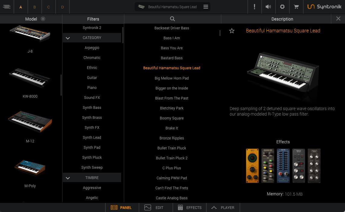 Syntronik 2 为现代虚拟合成器设定了新标准。IK先进的采样技术与混合采样和建模合成引擎相结合,为稀有和广受欢迎的合成器的全面集合提供动力,具有惊人的声音准确性和最深入的编辑。