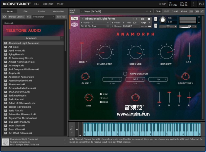 - 超过100个独特的音色补丁:Anamorph的音色补丁集合由各种样本源制作而成,包括复古模拟合成器、大钢琴和立式钢琴、电钢琴、颤音琴、蝴蝶钢琴等。