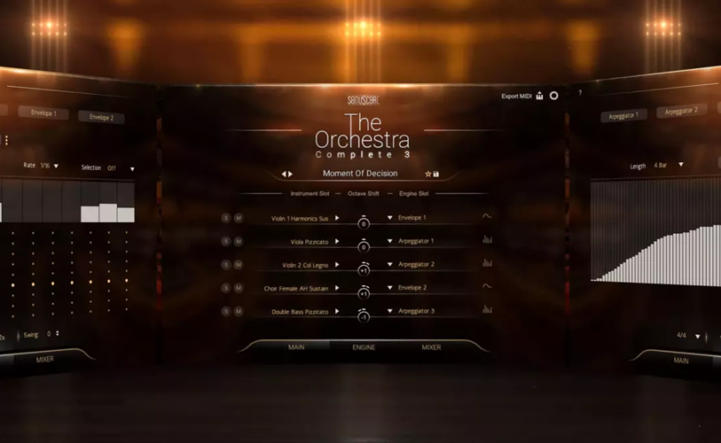 Sonuscore The Orchestra Complete 3 的核心功能是它的编曲引擎,它可以让您通过简单的和弦来自动生成复杂的管弦乐安排。您可以使用预设的音序模式,或者自己设计您想要的音序模式。您还可以使用自由演奏模式,来根据您的键盘输入来分配不同的乐器组合。