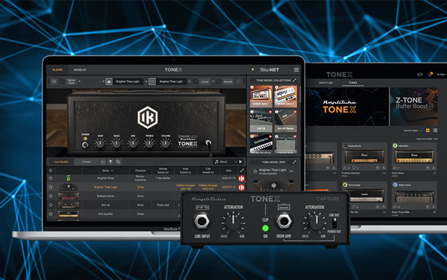 - TONEX MAX 附带一个包含数千种预设的庞大音色库,包括经典和现代放大器、箱体和效果器音色。用户也可以访问 IK Multimedia 的 ToneNET 在线平台,下载其他用户上传的音色。