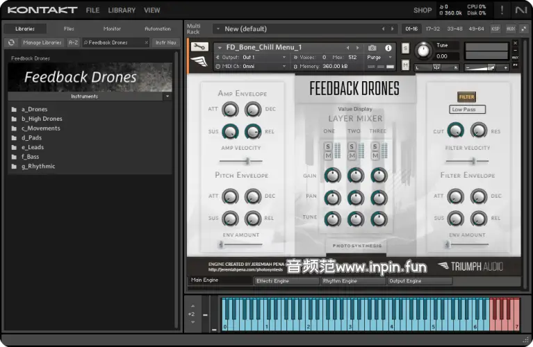 Triumph Audio 的 Feedback Drones 是一款专为电影配乐、科幻、恐怖、氛围、悬疑、新世纪、流行、预告片、舞曲和节拍制作等多种音乐风格设计的强大音色库。 该音色库通过精心捕捉和处理的反馈声,提供丰富的无人机音色、铺底、主音、贝斯和节奏脉冲,为音乐创作者提供广泛的声音选择。