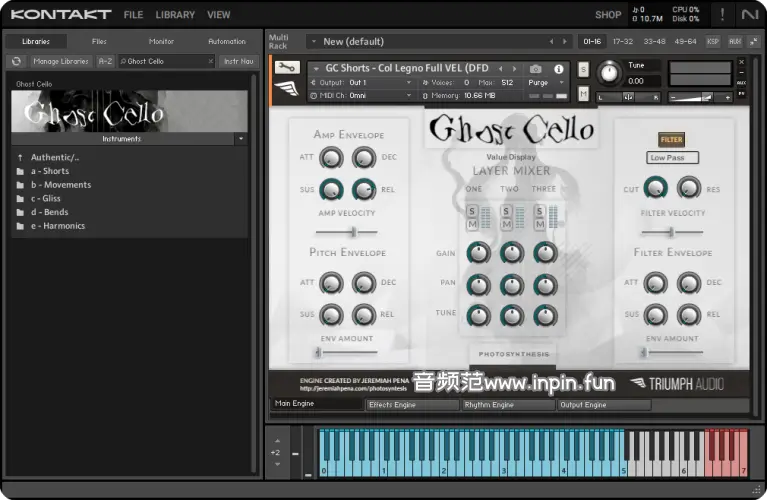 Triumph Audio 的 Ghost Cello 是一款独特的大提琴音色库,专为电影配乐、氛围音乐和实验性音乐制作设计,提供真实且经过处理的大提琴音色,涵盖从传统演奏到幽灵般的音效。