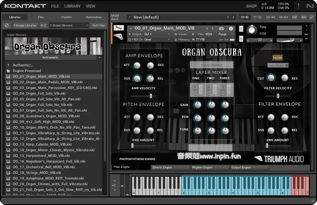 Organ Obscura 由 Triumph Audio 出品,是一款对 20 世纪 60 年代晚期 Baldwin 风琴 进行复古与现代融合的创新音源。受 Bernard Herrmann(伯纳德·赫尔曼) 标志性音景的启发,我们不仅保留了这款风琴温暖而熟悉的怀旧质感,更将其推向了充满创意的全新领域。在这里,您不仅可以找到忠实还原的经典音色,还可以探索新奇大胆的前卫声音,将复古的魅力重新演绎为现代音乐制作的灵感源泉。