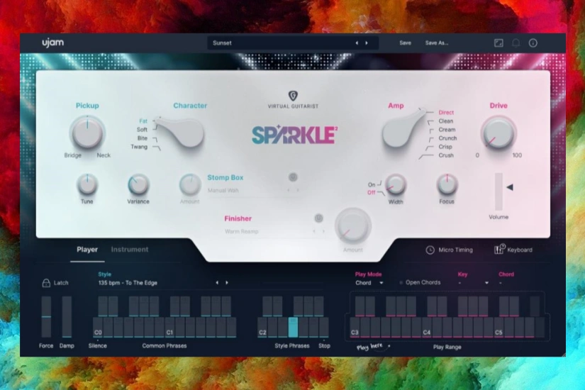uJAM Virtual Guitarist SPARKLE 2 是一款电吉他虚拟乐器插件,专为制作吉他伴奏而设计。它提供了从清脆的节奏吉他到驱动和失真的独立摇滚音色的广泛声音范围。SPARKLE 2 特别适合制作流行音乐轨道,无论是需要放克风格的吉他演奏还是现代电子流行音乐的吉他声音。